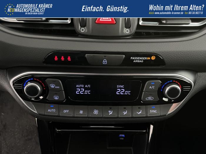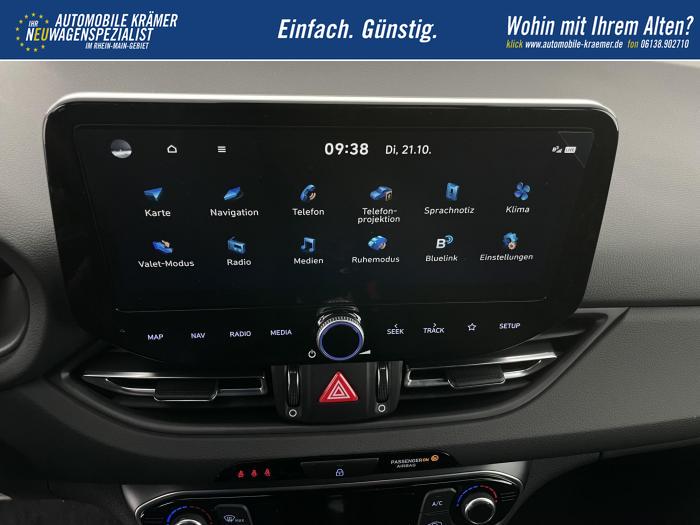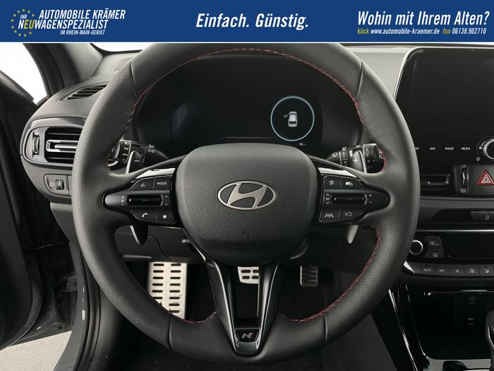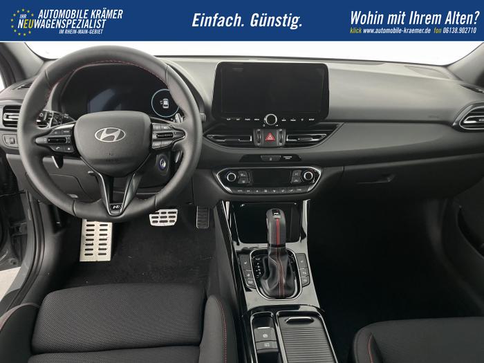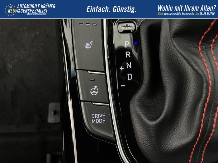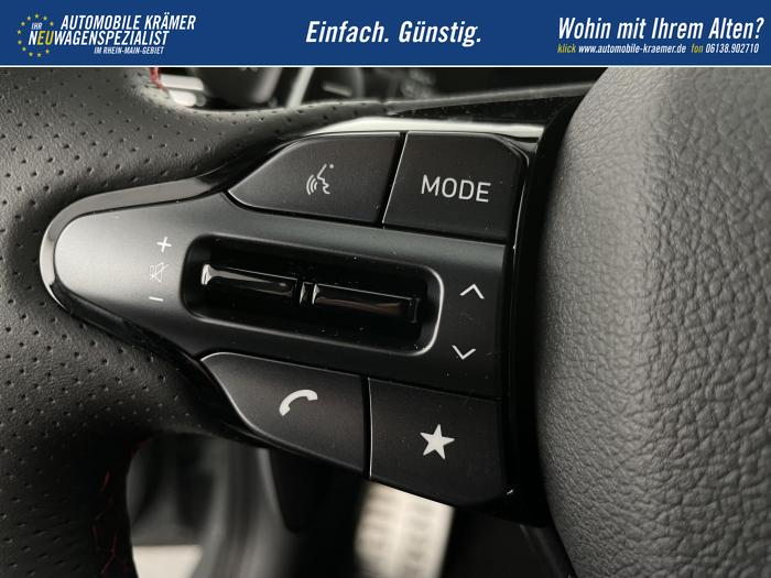 Android Auto, Apple CarPlay, Bluetooth, Navigationssystem 10,25'', Sprachsteuerung, USB-Anschluss, Bi-LED-Scheinwerfer, LED Tagfahrlicht, LED-Rückleuchten, Lichtsensor, Elektrische Fensterhebern vorn und hinten, Getönte Scheiben, Dachhimmel in Schwarz, Gepäcktrennnetz, Lenkradheizung, Mittelarmlehne vorn und hinten, Spiegel automatisch abblendbar, Sport - Multifunktionslenkrad, Sport-Pedale in Edelstahl, Automatische Zweizonen - Klimaregelung , 18'' Alufelgen der Größe 225/40 R18, Alarmanlage, Elektrische Parkbremse mit AutoHold, Fahrer- und Beifahrerairbag, ISOFIX + TopTether, Vorder- und Seitenaribags, Beifahrersitz höhenverstellbar, Fahrersitz höhenverstellbar, Fahrersitz mit elektrischer Lendenwirbelstütze, Vordersitze beheizbar, Hyundai Garantie 5 Jahre, Aktiver Spurfolgeassistent LFA, Autonomer Notbremsassistent, Fahrprofilauswahl, Frontkollisionswarner mit Fußgänger-/Fahrradfahrererken-nung FCA, Intelligente Geschwindigkeitsassistent ISLA, Park Distance Control vorne und hinten, Reifendruck-Kontrollsystem, Rückfahrkamera, Spurhalteassistent LKA, Tempomat, Zentralverriegelung mit Fernbedienung, [ISLA] adaptive Geschwindigkeitsregelanlage, Start/Stopp-Automatik, Außenspiegel elektrisch anklappbar, Außenspiegel elektrisch beheizbar, Außenspiegel elektrisch einstellbar, Außenspiegelgehäuse in Schwarz, Dachreling, EU-Fahrzeug mit Tageszulassung