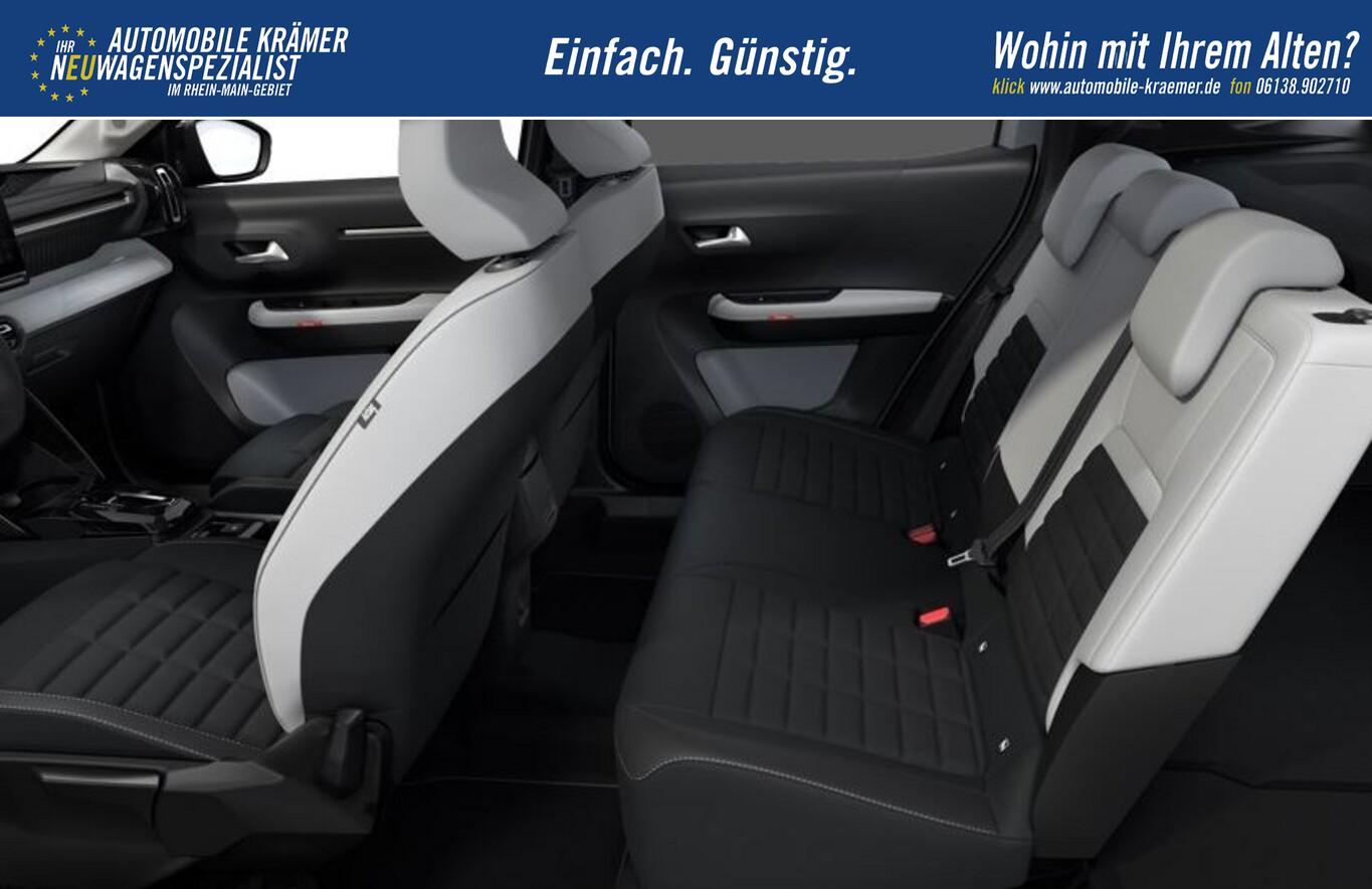 Innenausstattung: Ambiente Metropolitan Grey (Lenkrad heizbar / Sitzheizung vorn / Frontscheibe heizbar / Nebelscheinwerfer LED / Winter-Paket), Anti-Blockier-System (ABS), Einparkhilfe vorn, Elektron. Stabilitäts-Programm (ESP), Fahrassistenz-System: Spurassistent (AFIL), Fahrassistenz-System: Totwinkel-Assistent, Gepäckraumbeleuchtung, Geschwindigkeits-Regelanlage (Tempomat) inkl. Geschwindigkeits-Begrenzeranlage, Innenraumbeleuchtung LED, Innenspiegel mit Abblendautomatik, Kartentasche an den Rückseiten der Vordersitze, Kindersicherung manuell, Lenkrad mit Multifunktion, LM-Felgen 17", Navigationssystem inkl. 10"-Touchscreen, 6 Lautsprecher, USB-Schnittstelle (Typ C), Radioempfang digital (DAB), Reifen 215/60 R17, Schadstoffarm nach Abgasnorm Euro 6e (EU6 EA), Servolenkung, Sitzbezug / Polsterung: Stoff/Kunstleder, Smartphone-Schnittstelle (Apple CarPlay & Android Auto), Verzurrösen im Gepäckraum, Mittelarmlehne vorn (Mittelkonsole mit Ablagefach), Fahrassistenz-System: Automatische Fahrlichtschaltung inkl. Fernlichtassistent (Einschaltautomatik für Fahrlicht), Einparkhilfe hinten inkl. Rückfahrkamera (Rückfahrkamera), Citroen Advanced Comfort Sitze, Heckscheibe heizbar, Heckscheibenwischer, Karosserie: 5-türig, Koffer-/Laderaumboden variabel (Moduboard), Lenksäule (Lenkrad) mech. höhen-/längsverstellbar, Mild-Hybrid 100 kW (Motor 1,2 Ltr. - 100 kW), Otto-Partikelfilter (GPF), Parkbremse elektrisch, Radstand 2670 mm, Sitz vorn links höhenverstellbar, Steckdose (12V-Anschluß) in Mittelkonsole vorn, Antriebsart: Frontantrieb, Getriebe Automatik - Doppelkupplungsgetriebe (6-Stufen, Hybrid), Klimaautomatik, Airbag Beifahrerseite abschaltbar, Airbag Fahrer-/Beifahrerseite, Kopf-Airbag-System und Seitenairbag, Fensterheber elektrisch hinten, Fensterheber elektrisch vorn, Isofix-Aufnahmen für Kindersitz an Rücksitz, Rücksitzlehne geteilt/klappbar 1/3-2/3, Seitenscheiben hinten und Heckscheibe dunkel getönt, Zentralverriegelung mit Fernbedienung, Head-up-Display, Dachreling schwarz, Fahrassistenz-System: Verkehrszeichenerkennung, Außenspiegel elektr. verstell-, heiz- und anklappbar, Scheibenwischer mit Regensensor, Scheinwerfer Eco-LED, Tagfahrlicht LED, Reifendruck-Kontrollsystem