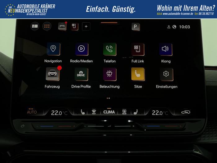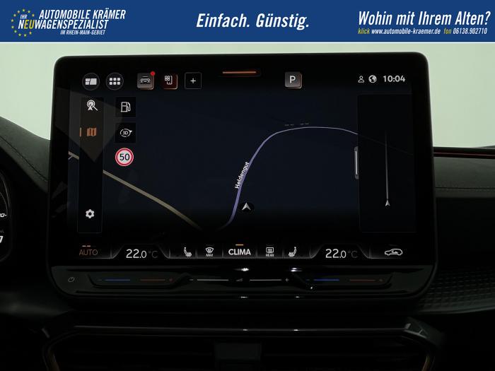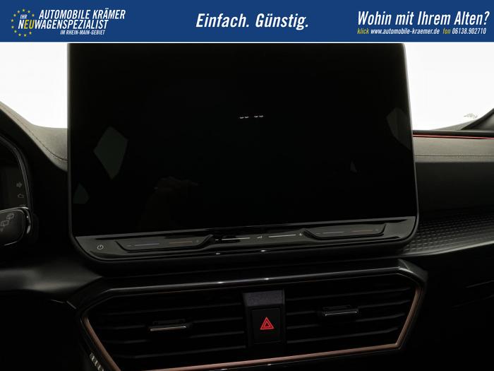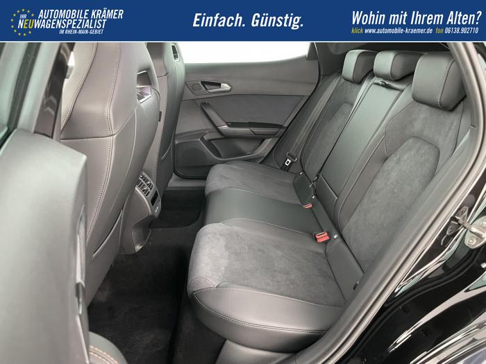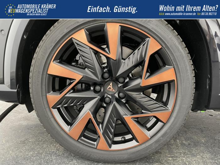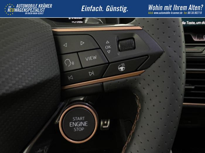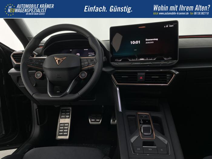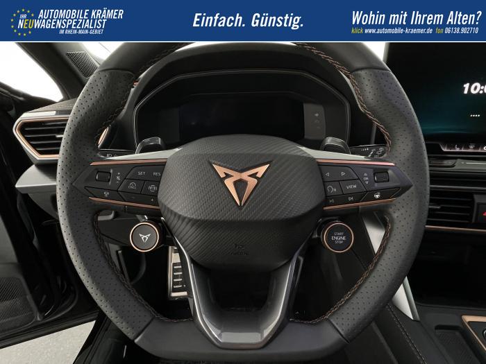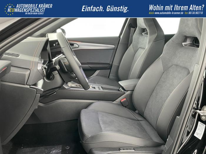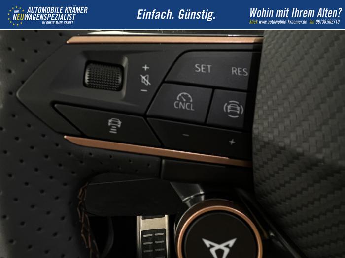 6 Lautsprecher, Android Auto, App Connect, Apple CarPlay, Bluetooth, Connectivity Box inkl. Wireless Charger, Digitaler Radioempfang DAB , Freisprecheinrichtung, Navigationssystem, Smart Link, Sprachsteuerung, USB-C-Schnittstelle 2 vorne / 2 hinten (Ladefunktion), Wireless Full Link Connectivity inkl. Android Auto und Apple CarPlay, Automatisch abblendendes Fernlicht, Automatische Coming- und Leaving-Home-Funktion, Blendfreies Fernlicht, Infinity Light, Dynamisches LED-Lichtband am Heck und beleuchtetem CUPRA Logo, LED - Tagfahrlicht, Lichtsensor, Matrix-LED-Scheinwerfer mit Signatur Ceremony, Nebelscheinwerfer, Smart Ambient Light, Tagfahrlicht, Türeinstiegsleisten beleuchtet, vorne, Voll-LED-Heckleuchten, Fensterheber elektrisch vorne und hinten, Fensterheber elektrisch, mit Einkleschutz und One-Touch-Funktion, Seitenscheiben ab 2. Sitzreihe und Heckscheibe dunkel getönt, CUPRA Supersport-Multifunktionslenkrad mit CUPRA Mode Selector, beheizbar, Dachhimmel in Schwarz, Durchladeeinrichtung, Innenspiegel automatisch abblendend, Lederlenkrad, Lenkrad höhen- und tiefenverstellbar, Lenkradheizung, Mittelarmlehne vorn, Mittelarmlehne vorne und hinten, Nichtraucherausführung, Schaltwippen am Lenkrad, Sportlenkrad, Variabler Gepäckraumboden mit Staufächern im Gepäckraum, 3 Klimazonen, Climatronic mit 3-Zonen-Temperaturregelung, Dynamic Design Paket, Edge Paket, Intelligent Drive Paket XL (Spurwechselassistent ''Side Assist'' inkl. Totwinkel- und Ausparkassistent mit Ausstiegswarnung Spurhalteassistent Plus inkl. Travel Assist, Emergency Assist und Stauassistent PreCrash Assist (Proaktives Insassenschutzsystem) Top View Kamera Parklenkassistent ''Intelligenter Park Assist''), Licht-und-Sicht Paket, Pure Performance Paket inkl Matrix LED-Scheinwerfern, Winter-Paket (Vordersitze beheizbar), Winterpaket, 19 Leichtmetallräder Sandstorm Black/ Copper, glanzgedreht, Sommerreifen, ABS (Antiblockiersystem), Airbag für Fahrer und Beifahrer, Beifahrerairbag-Deaktivierung, Diebstahl-Warnanlage inkl. Innenraumüberwachung, Back-up-Horn und Abschleppschutz, ESP (Elektronisches Stabilitätsprogramm), ISOFIX-Kindersitz-Sicherungssystem, in der 2. Sitzreihe links und rechts inkl. Top-Tether-Verankerungspunkte, Kopfairbag-System, vorne und hinten, Notruf-Service, PreCrash Assist (Proaktives Insassenschutzsystem), Seitenairbag für Fahrer und Beifahrer, Seitenairbags hinten, Servolenkung, Beifahrersitz höhenverstellbar, CUPRA Sportschalensitze vorne mit Sitzmittelbahn in Dinamica, in Soul Schwarz mit Akzenten in Astro Blau, Elektrische Sitzeinstellung, Fahrersitz elektrisch einstellbar mit Memory Funktion, Fahrersitz höhenverstellbar, Geteilte Rücksitzbank, Lendenwirbelstütze Fahrerseite, elektrisch einstellbar, Rücksitzlehne asymmetrisch geteilt umklappbar, Sitzheizung, Anschlussgarantie 3 Jahre / 100.000 km, CUPRA Connect Plus (3 Jahre), Ausparkassistent, Automatische Distanzregelung ACC, Automatische Heckklappe, CUPRA Drive Profile, Einparkhilfe vorne und hinten, Elektronische Parkbremse inkl. Auto Hold Funktion, Exit Assist, Fernlichtassistent, Intelligenter Parklenkassistent, Kessy Advanced, Schlüsselloses Schließ- und Öffnungssystem, Müdigkeitserkennung, Regensensor, Reifenkontrollanzeige, Rückfahrkamera, Side Assist inkl. Totwinkelassistent, Spurhalteassistent Plus inkl. Travel Assist, Emergency Assist und Stauassistent, Spurwechselassistent, Tempomat, Top View Kamera, Ultraschall-Einparkhilfe, vorne und hinten, Umfeldbeobachtungssystem Front Assist mit City-Notbremsfunktion, Verkehrszeichenerkennung, Virtual Cockpit, Zentralverriegelung, Zentralverriegelung mit Funkfernbedienung, Adaptive Fahrwerksregelung DCC, Anhängevorrichtung, schwenkbar mit elektrischer Entriegelung und Anhängerrangierassistent, Außenspiegel elektrisch beheizbar, Außenspiegel elektrisch einstell-, anklapp- und beheizbar, Außenspiegel elektrisch einstellbar, Außenspiegelkappen in Dark Aluminium, Dachreling in Glossy Black, Heckklappe elektrisch betätigt (Öffnung & Schließung) inkl. Sensorgesteuerter Öffnung & Schließung (Virtual Pedal), Leisten an den Seitenfenstern (außen) in Glossy Black, EU-Fahrzeug mit Tageszulassung